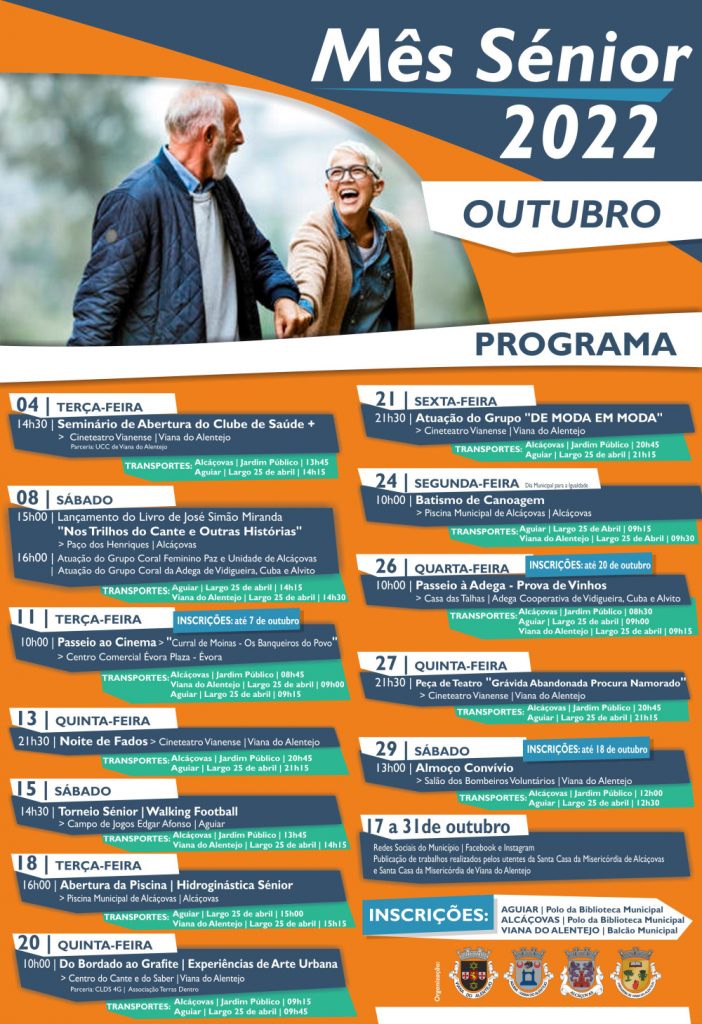 Entre os dias 4 e 29 de outubro está de volta ao concelho de Viana do Alentejo o Mês Sénior. Lançamento de livro, cinema, noite de fados, passeio à adega, batismo de canoagem e o almoço convívio são algumas das atividades que compõem a programação do Mês Sénior, organizado pelo Município de Viana do Alentejo e pelas três Juntas de Freguesia.
